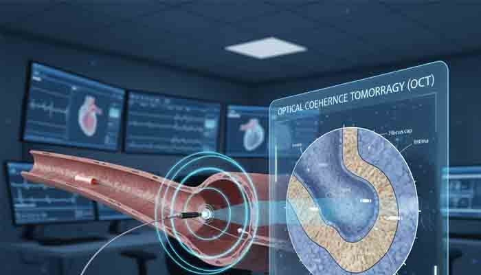 Optical Coherence Tomography (OCT) is one of the most advanced imaging technologies used in interventional cardiology today. It provides microscopic-level clarity of the coronary arteries, offering far greater detail than traditional angiography or even Intravascular Ultrasound (IVUS). Using near-infrared light, OCT generates high-resolution, cross-sectional images of the inside of coronary arteries — allowing cardiologists to visualize the vessel wall structure, plaque characteristics, and stent placement with unmatched precision.